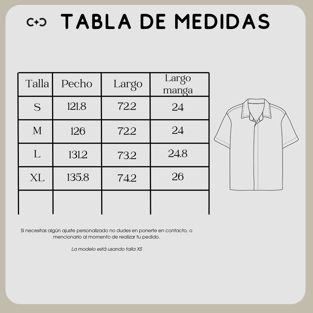 Blusa oversize fit. Cuello camisero y manga corta. Cierre frontal con abotonadura oculta.
