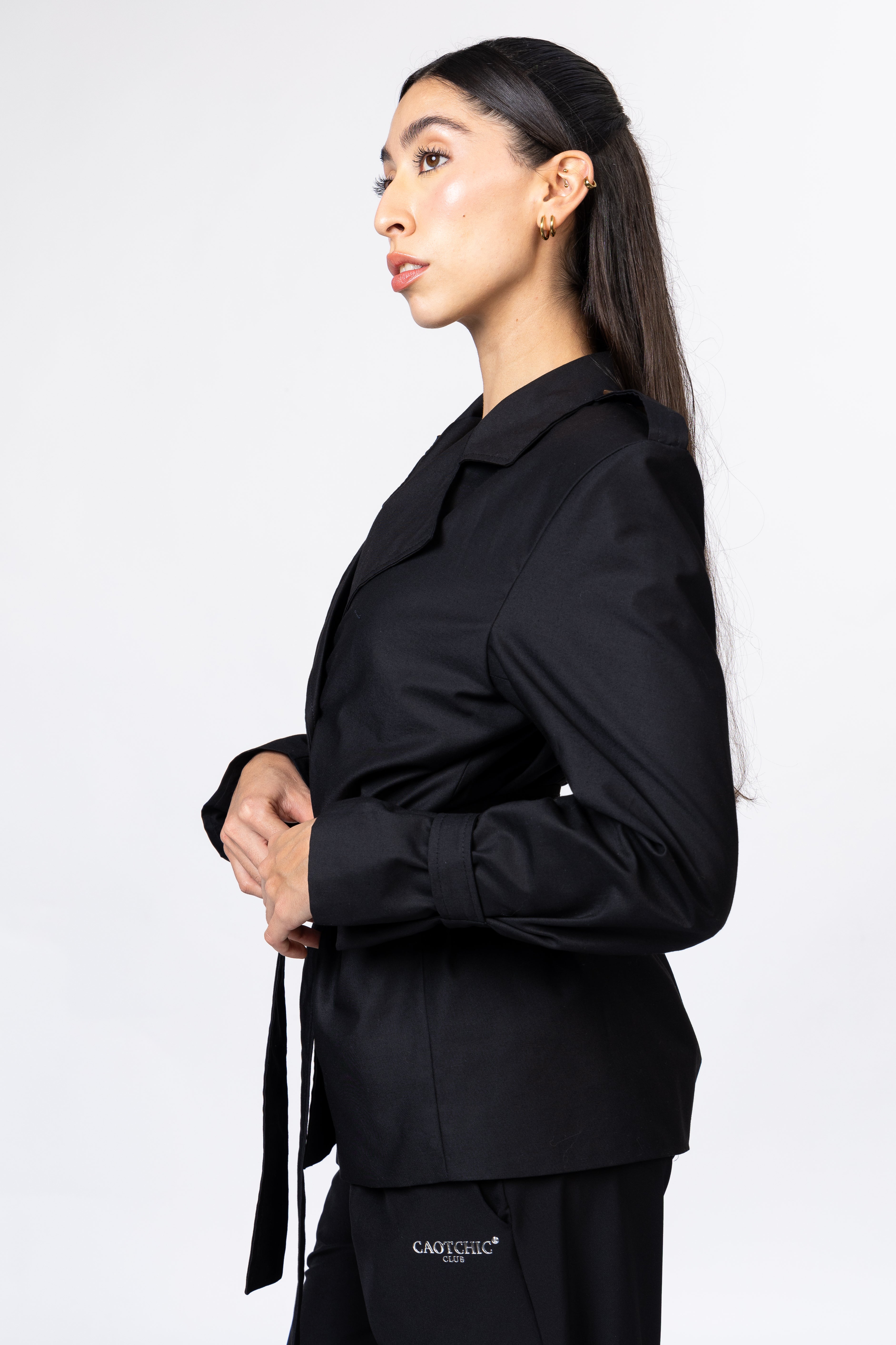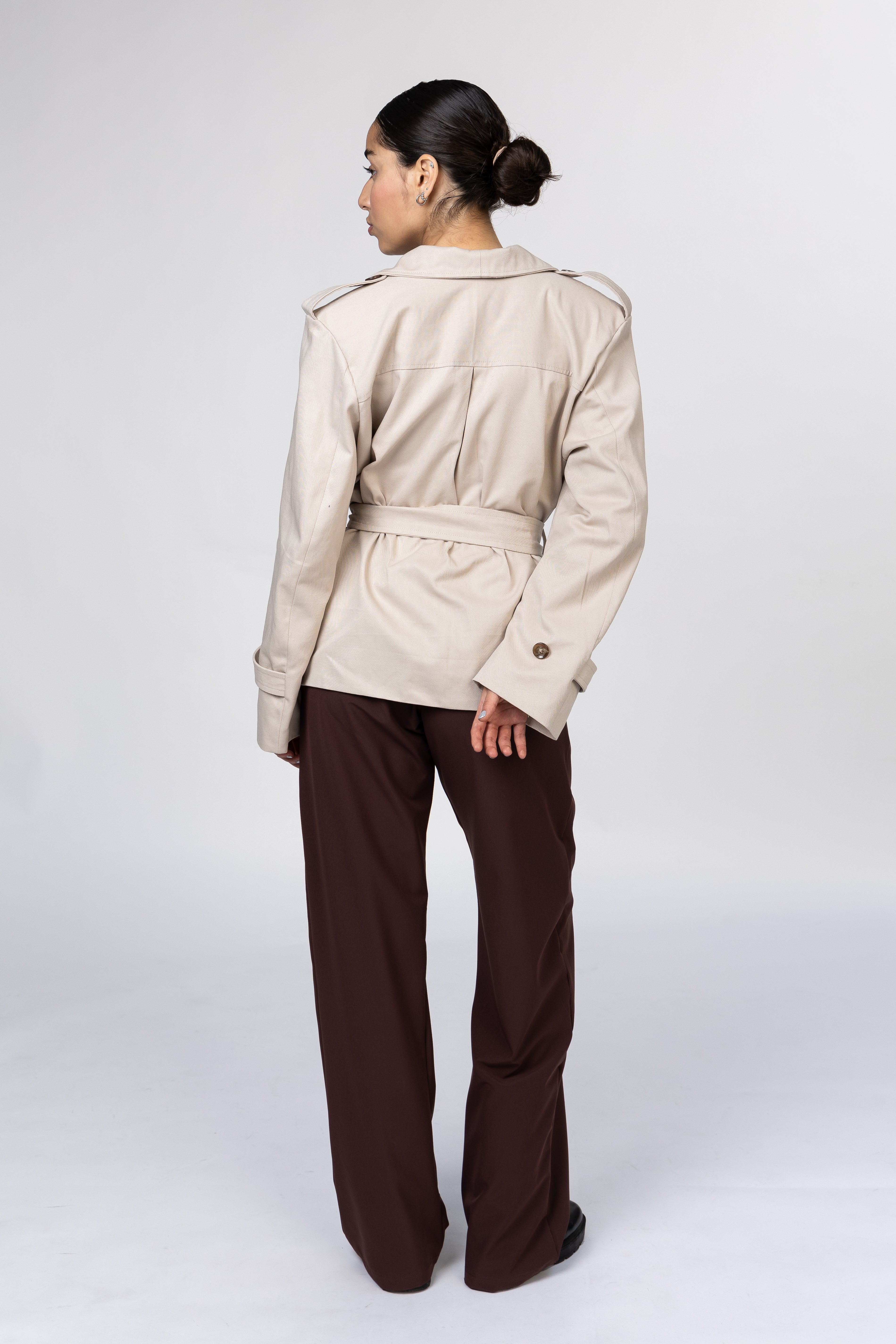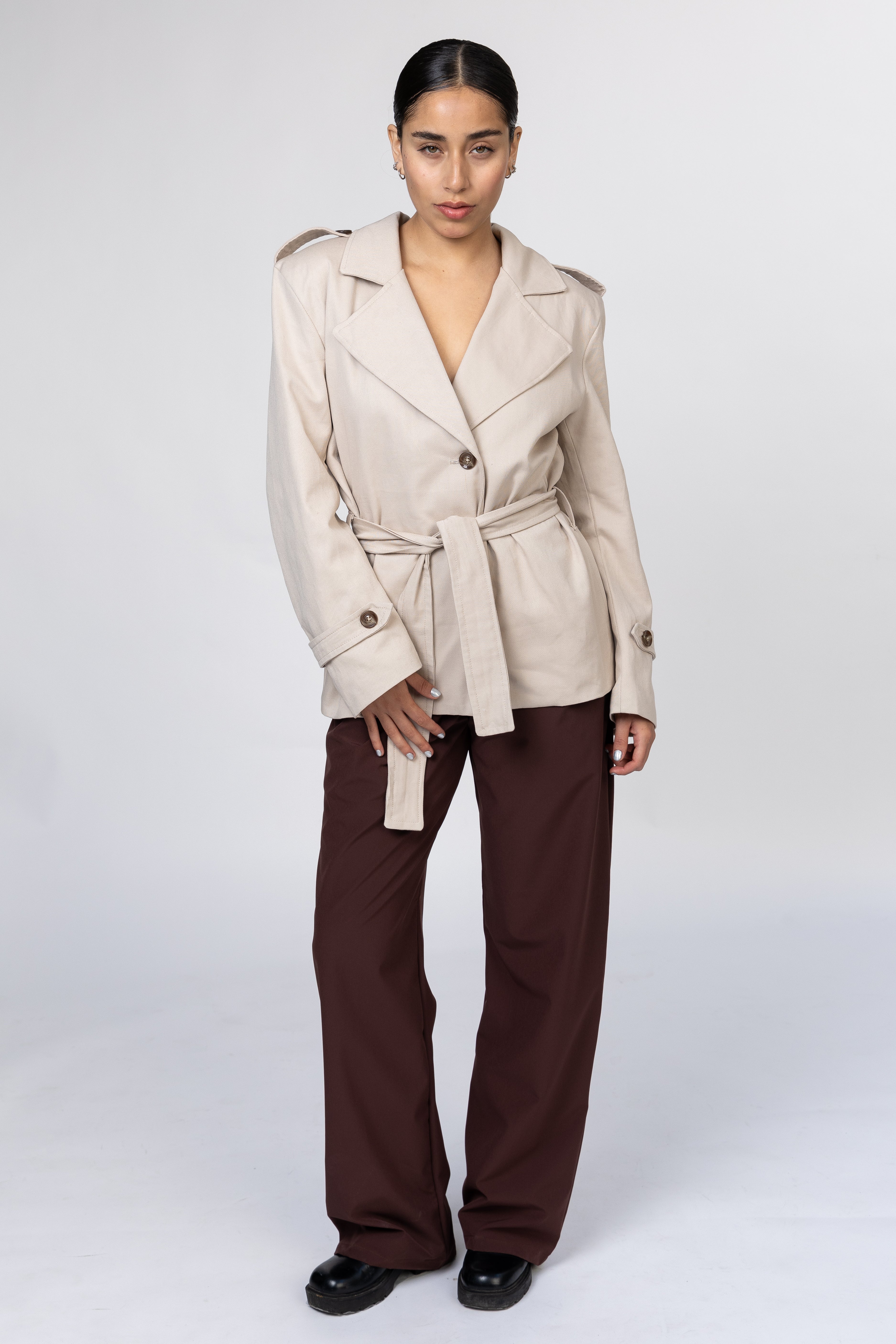 Gabardina oversize, cruzada. Hombro pasado. Cierre al frente con botones. Cintilla para ajustar; detalles en puño y hombro. Cuello amplio y con solapa. Detalle de pliegue en espalda.