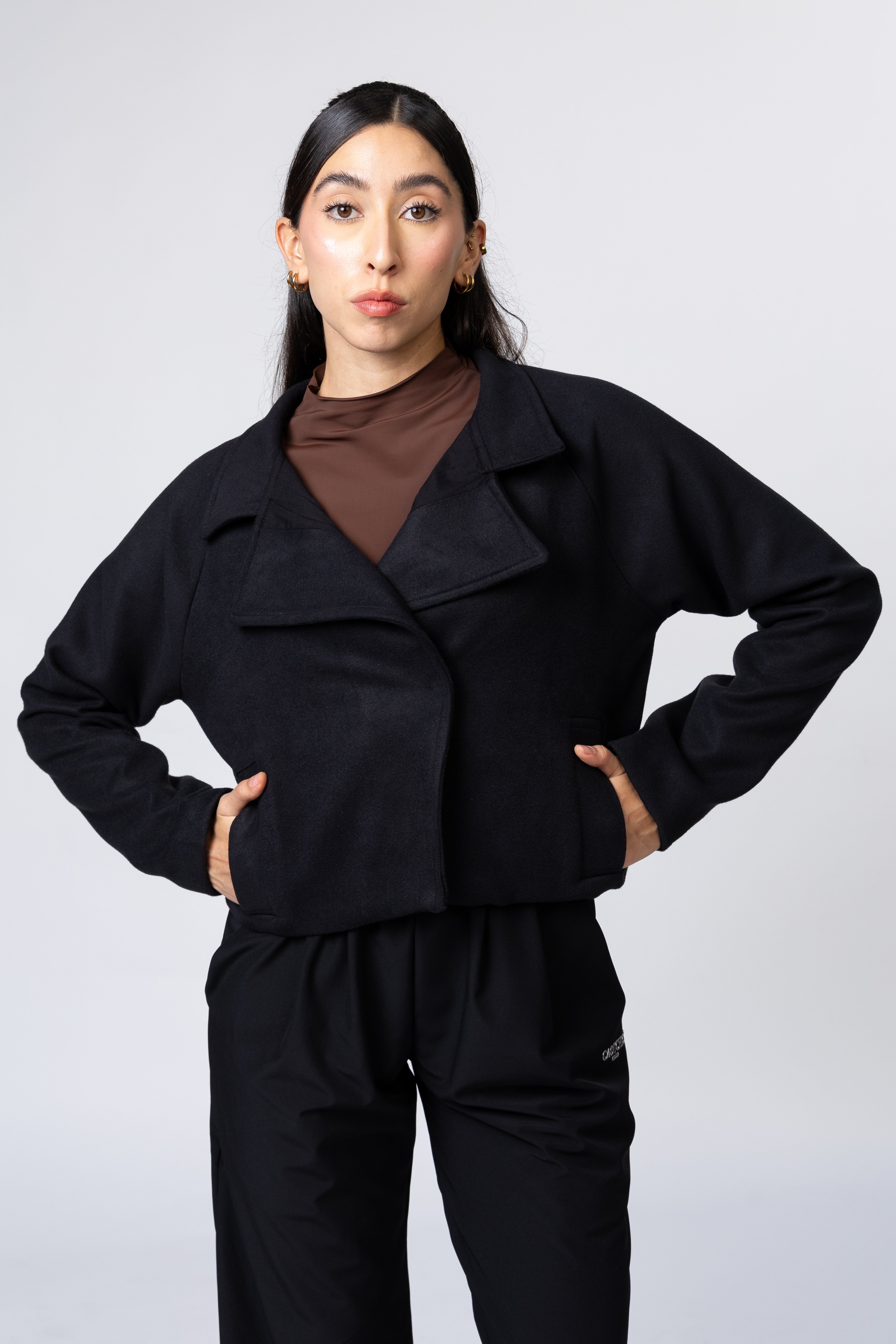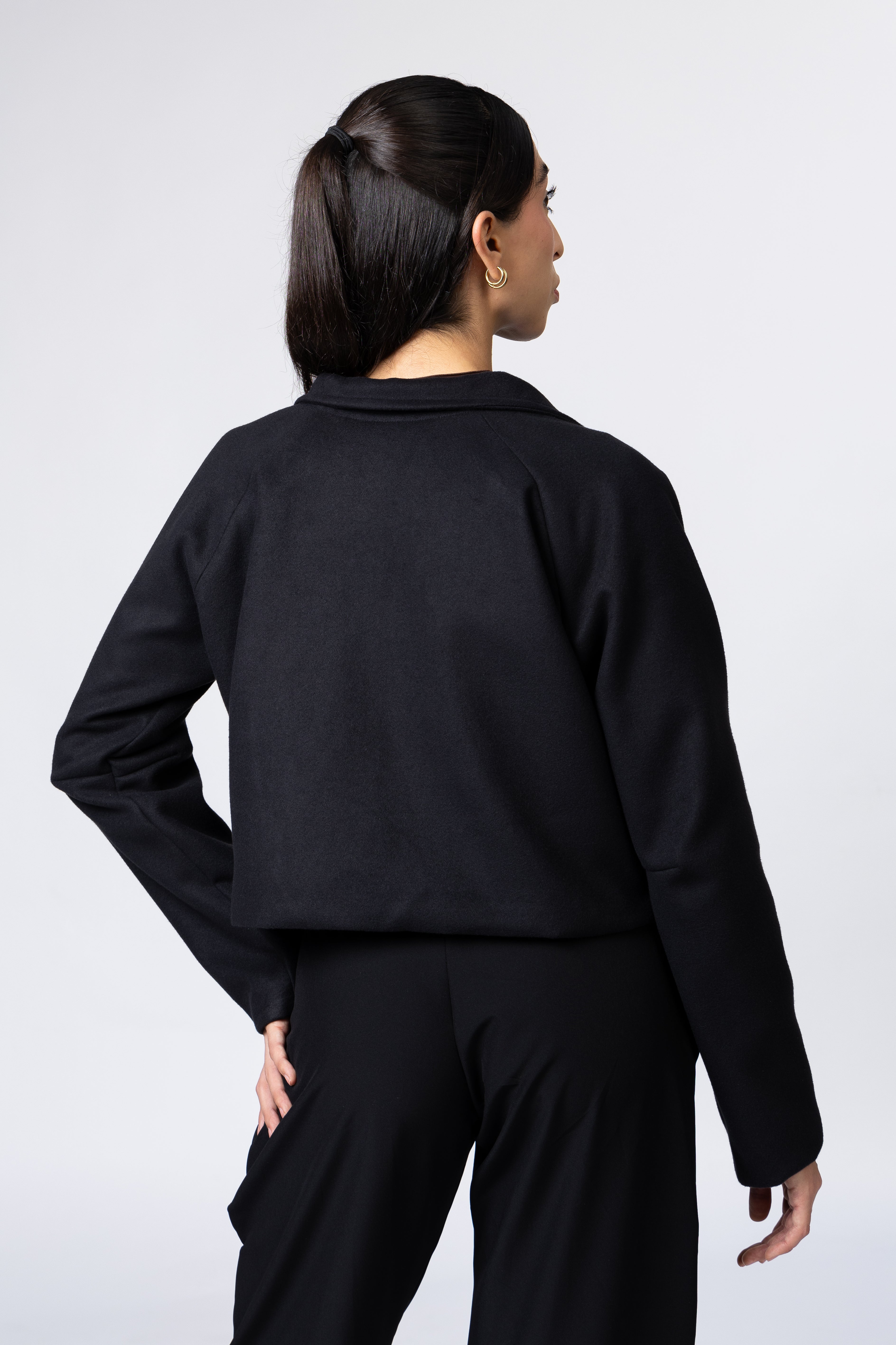 Chaqueta corta de lana forrada y con frente asimétrico. Manga raglán. Bolsillos frontales. Cuello sport.