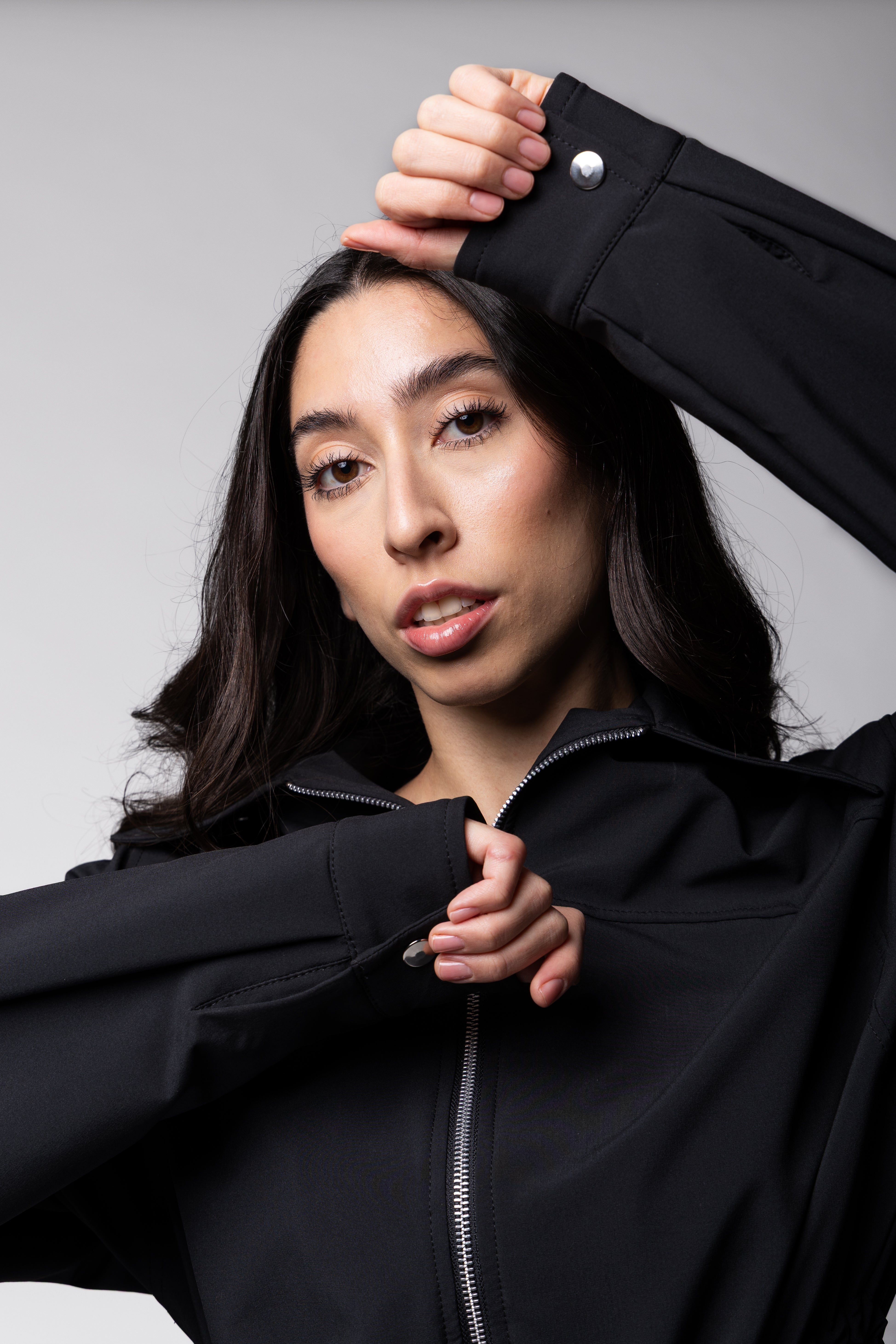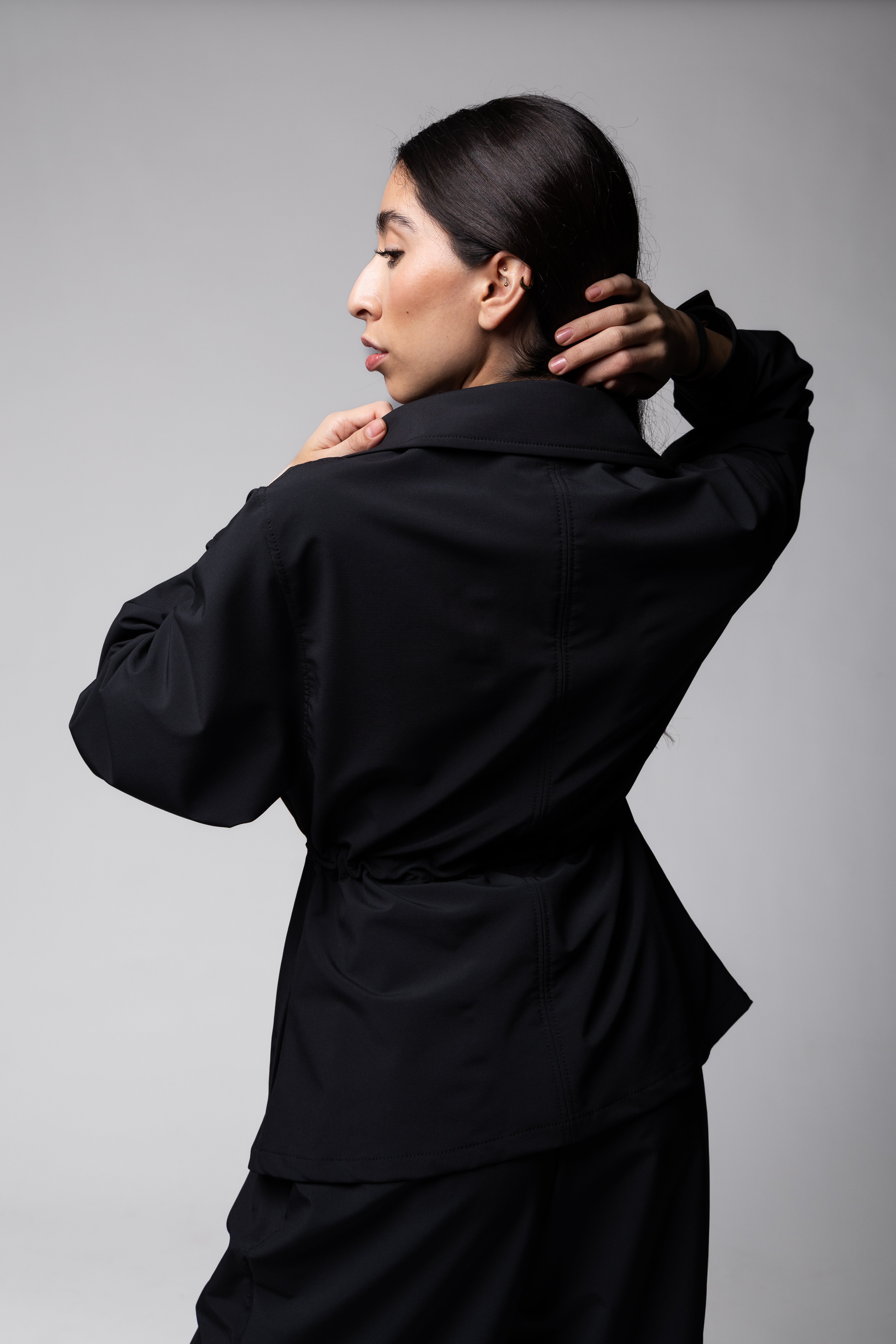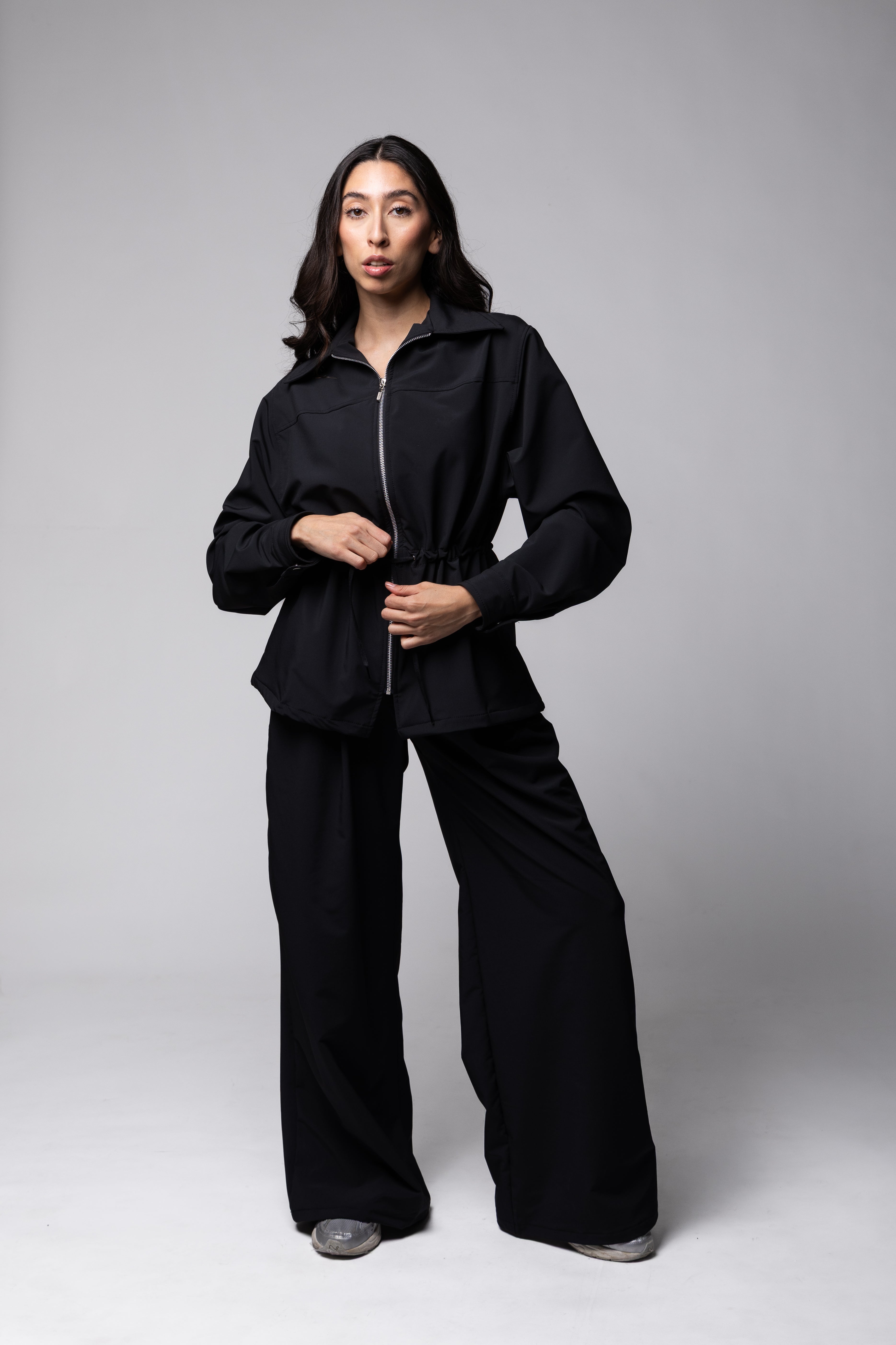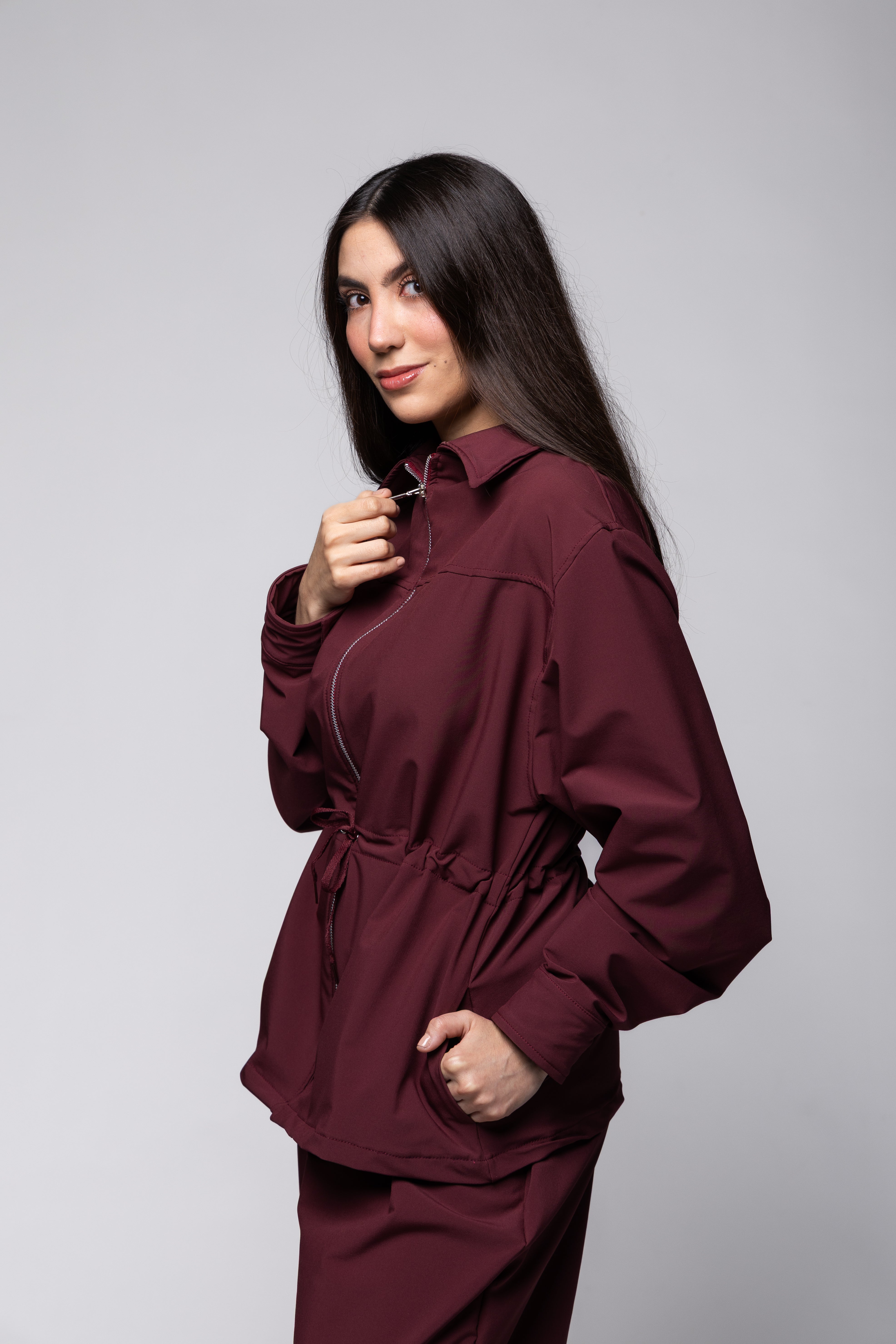 Chamarra oversize con cuello, con tira ajustable en la cintura. Manga larga y puño. Con bolsillos frontales.