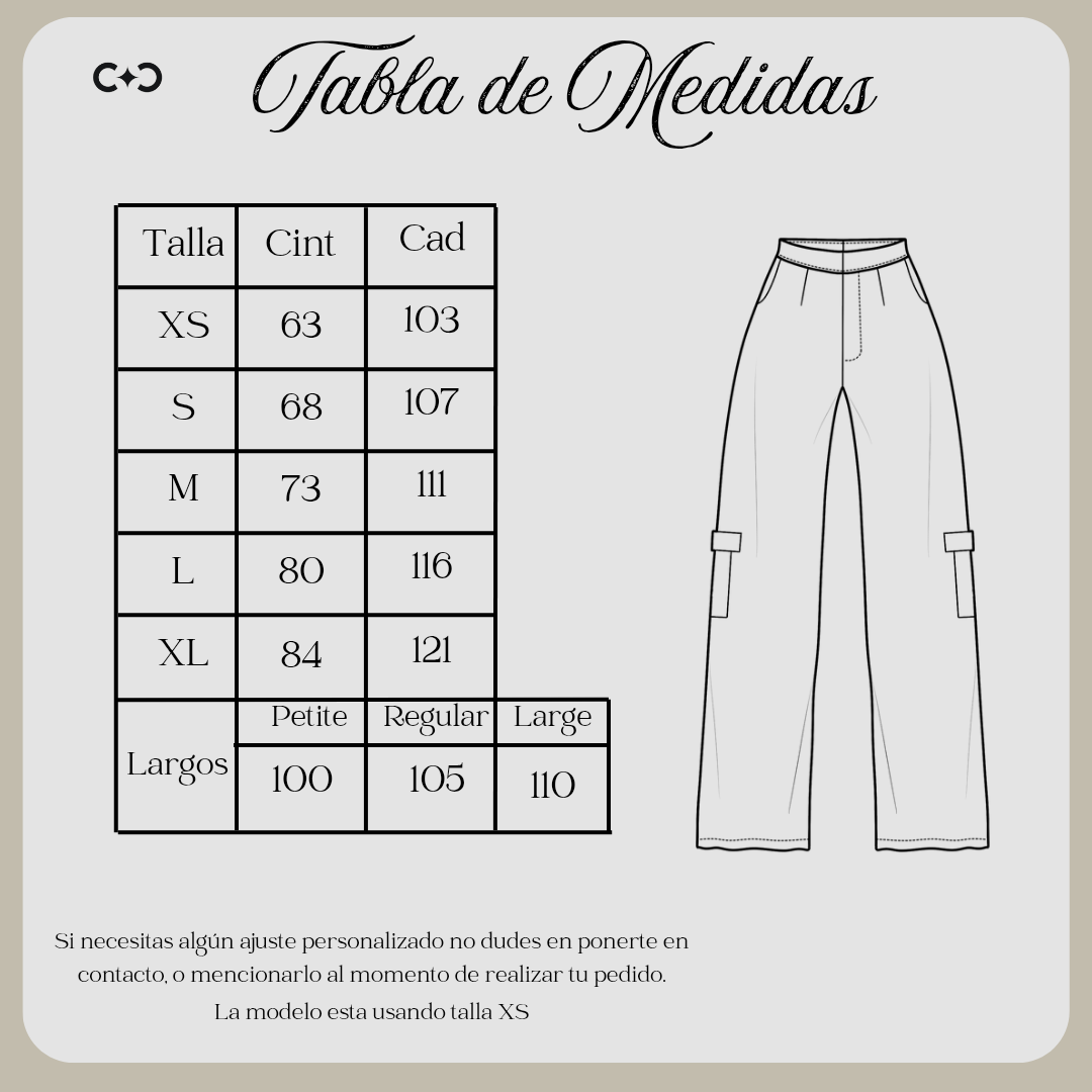 Con pantalón wide leg, pinzas delanteras y bolsillos frontales. Bolsos cargo en costados a media pierna. Cierre frontal con zipper y pretina con presillas.