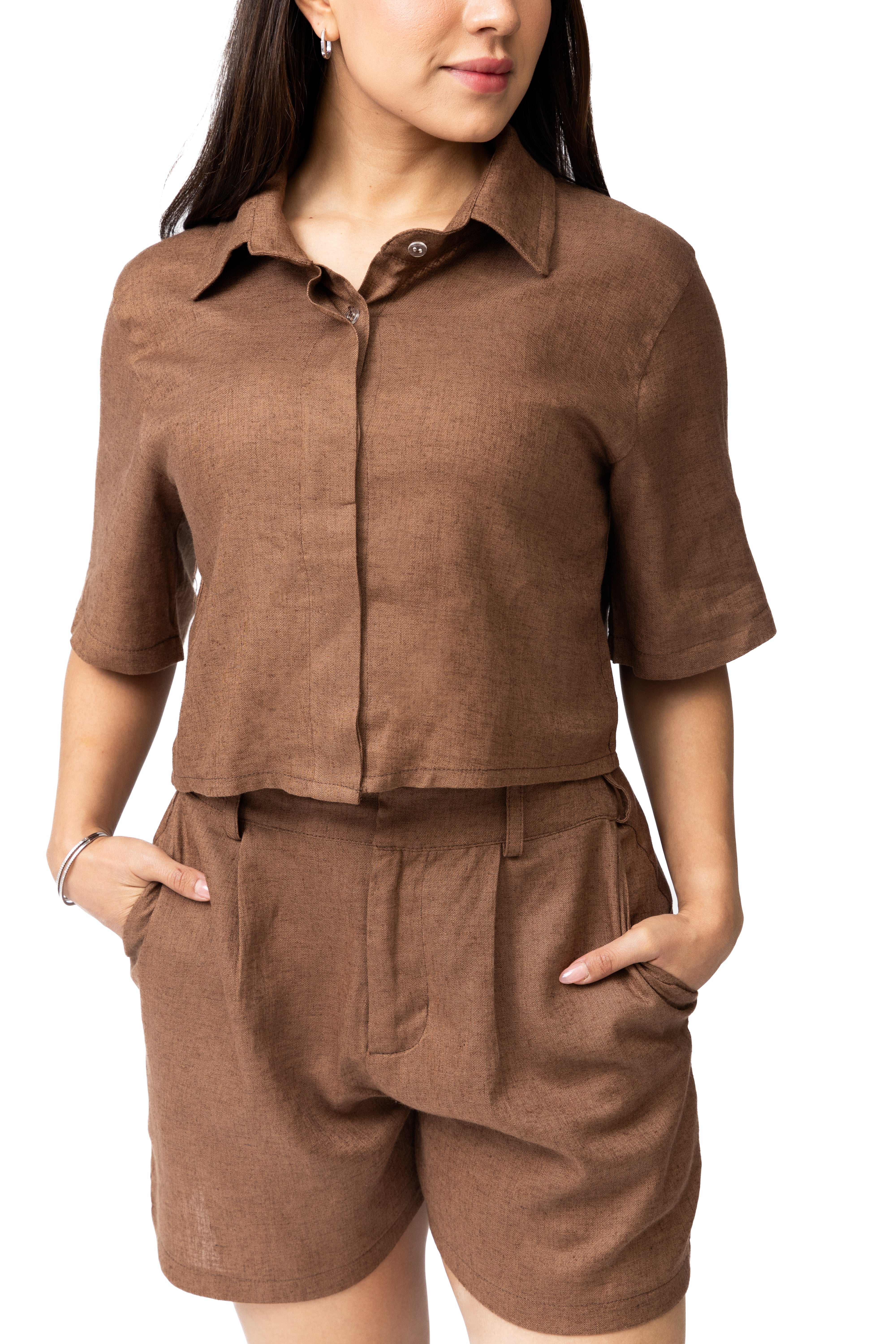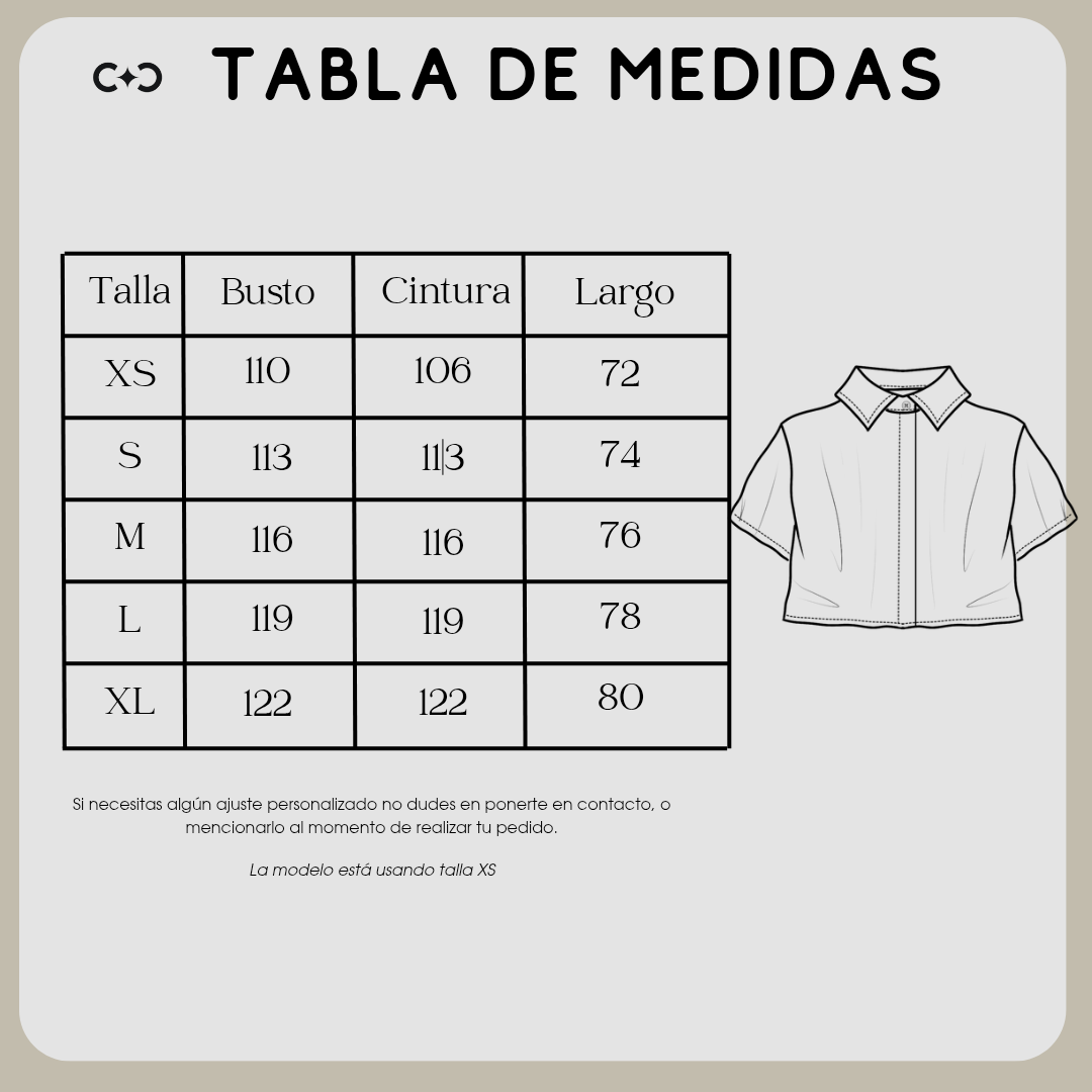 Camisa a cintura y manga corta. Cierre frontal con botones ocultos.