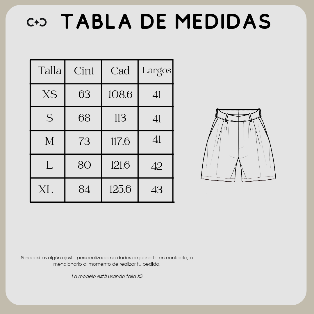 Short corto, con pinzas y bolsas frontales. Pretina con presillas. Cierre frontal con zipper.