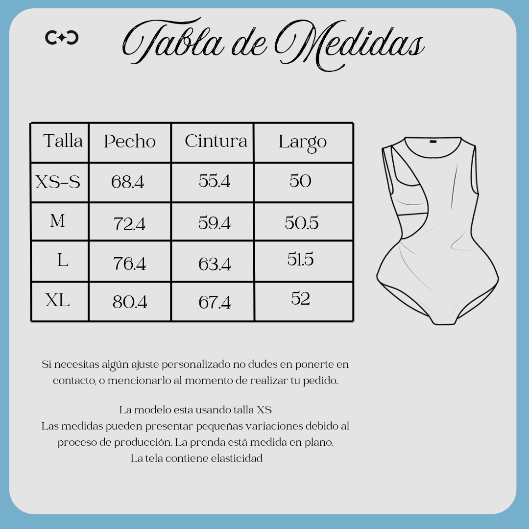 Body confeccionado en tela elástica. Cuello redondo. Detalle de cortes. Cierre en el bajo con botones de presión.