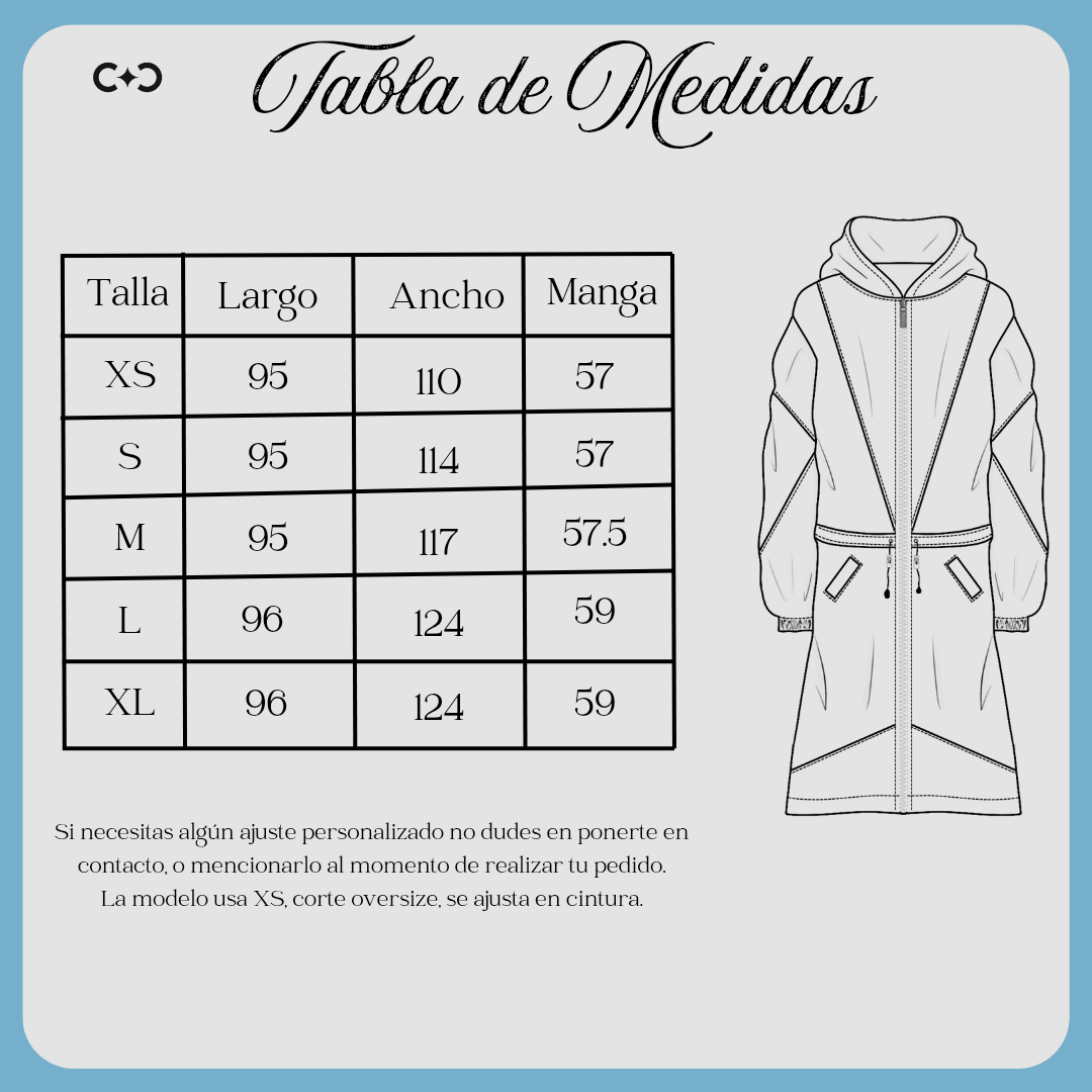 Coat confeccionado en tela repelente, mangas largas y capucha. Bolsillos frontales en vivo y cintura ajustable con cordón. Detalle del logo en color plata.