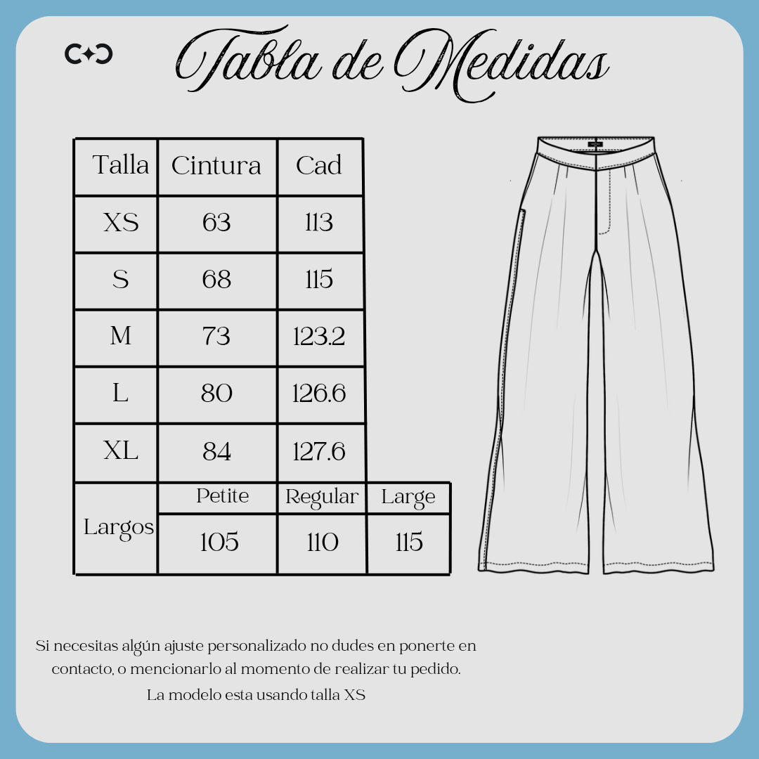 Pantalón wide leg, con cintura ceñida al cuerpo; bolsillos laterales y falsos bolsillos en espalda, cierre al frente con zipper y gancho interior. Cinta decorativa del lado derecho.